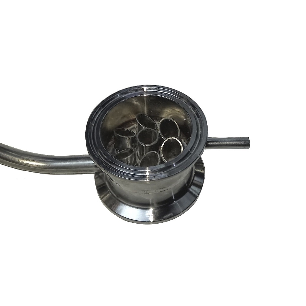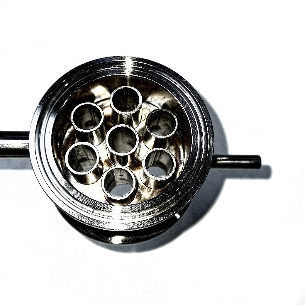 2. Основной холодильник на нашей колонне выполнен в виде кожухотрубного теплообменника, длиной 300 мм, с семью трубками внутри, внешним диаметром 12 мм, внутренним 10 мм. Холодильник крепиться к повороту на 90 градусов клампом, а не сварен с ним воедино. На конце холодильника так же на кламп установлен носик с ТСА.