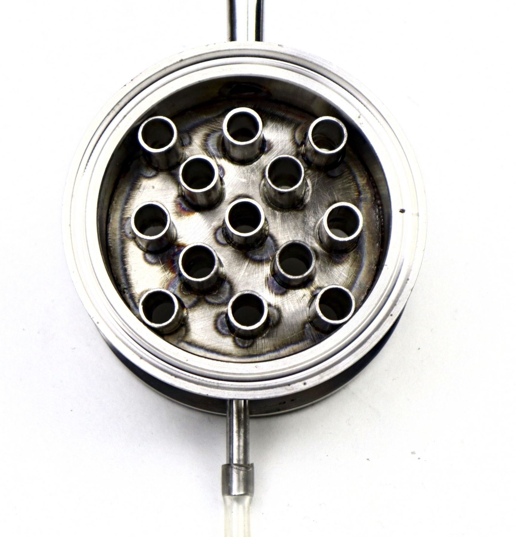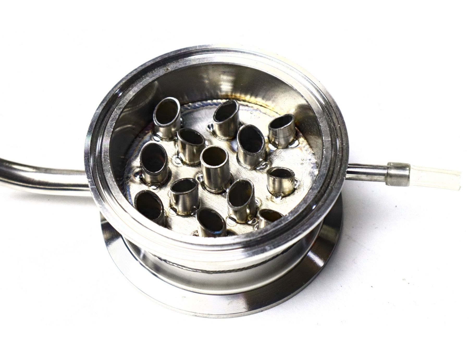 Основной холодильник на нашей колонне выполнен в виде кожухотрубного теплообменника, длиной 300 мм и диаметром 2 дюйма, с семью трубками внутри, внешним диаметром 12 мм, внутренним 10 мм. Холодильник крепиться к повороту на 90 градусов клампом, а не сварен с ним воедино. На конце холодильника так же на кламп установлен носик с ТСА.
